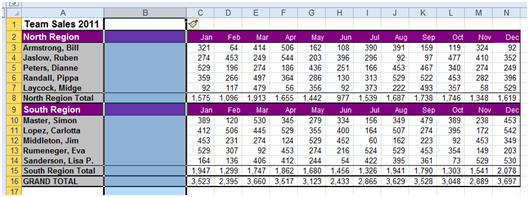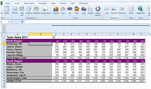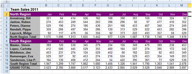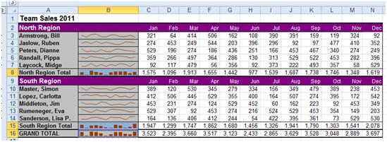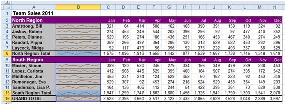 The monthly sales data for each member of a team is shown. We can look at the numbers for each team member but there is no simple visual snapshot of how each of them is doing, or of how the two sales regions are doing overall.