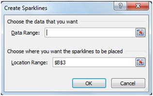 You can place the Sparkline in any worksheet cell, but Excel 2010 defaults to placing it in the cell you previously selected, which in this case is B3. That selection is shown in the Location Range box in the Create Sparklines dialog.