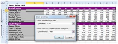 Until now Excel charts have been graphic objects that are generally positioned and sized independently of worksheet cells. In Excel 2010 Microsoft introduced the Sparkline, a new type of chart that actually lives in a worksheet cell. They can be particularly useful when you are short of space, or when you need to give a simple graphical message without a lot of detail or artistic elaboration.