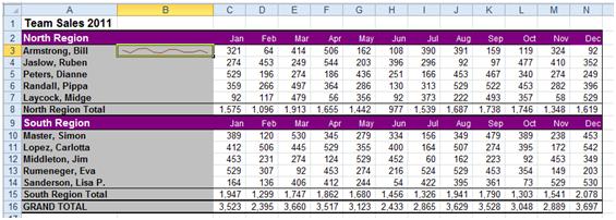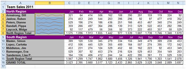 It’s easy to change the formatting of one or more Sparkline. Here I’ve selected the Sparklines for the two regional totals and the Grand Total.