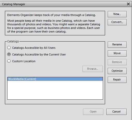 When the current catalog is selected – as it is here – there are buttons available to rename, move, optimize or repair it but not to remove it. The current catalog cannot be removed.